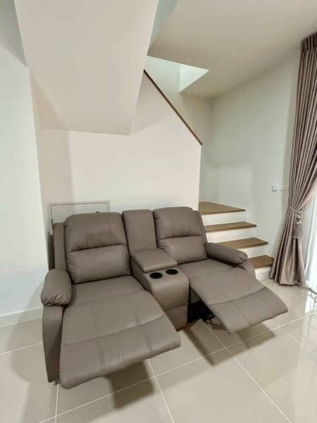 Newly decorated and fully furnished house available for rent at Pleno Sukhumvit Bangna 2, ready for occupancy on May 12. It includes four air conditioners, a washing machine, oven, refrigerator, electric stove, and hood. The master bedroom features a bed, wardrobe, dressing table, mattress, desk, and chair, while the small bedroom includes a bed and wardrobe. The multipurpose room has a 55-inch TV and storage, and the living room is equipped with a dining table, recliner sofa, kitchen counter, and TV stand. The rental price is 37,000 baht/month, with no pets allowed. Co-agents are welcome.